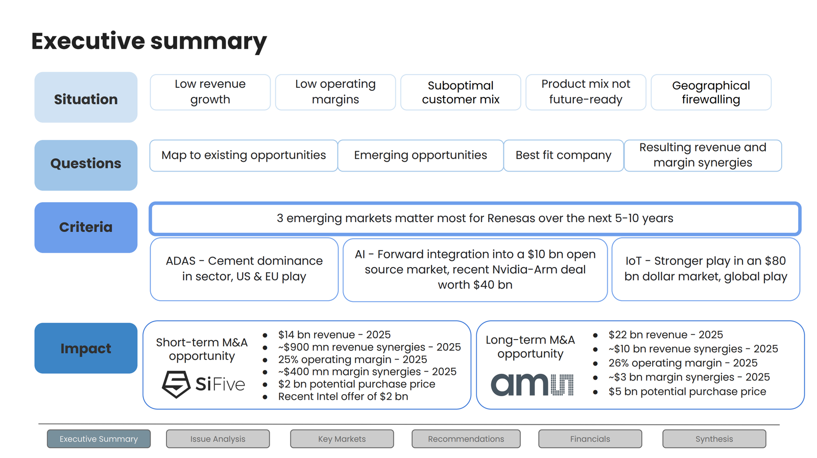 The Regional Case was on a semiconductor manufacturer, Renesas Electronics. We analysed their business using materials provided to us and found issues that needed to be solved. Placing 2nd in the Regional Case we qualified for the Global Case, wherein we analysed Arbe Robotics, a radar company.